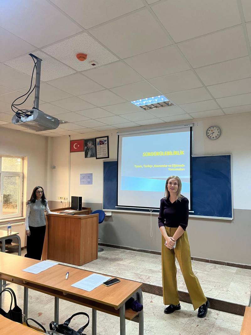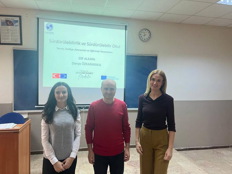 Elif Ayanoğlu Alkaya and Derya Özkarayaka made a presentation titled “Sustainability and Sustainable Schools” for the students of Sakarya University within the scope of the Sustain_EU Jean Monnet Module. The presentation addressed the definition, history, basic concepts and reflections of sustainability and sustainable schools in education. Derya Özkarayaka provided detailed information on international sustainability studies with a special focus on European Union’s Sustainability Agenda and contributed to students gaining a global perspective. Elif Alkaya provided information on sustainable schools, which are the most important reflections of sustainability studies in education, and created a productive discussion environment with students through application examples and case studies. At the end of the event, students gained detailed information on sustainability and sustainable schools and the effects of such studies on a sustainable future.